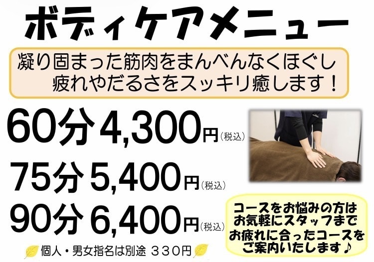 一番人気は60分コースですが、お疲れ気味の身体にはちょっと長めの75分コースがオススメです!ぜひリフレッシュしにいらしてください。