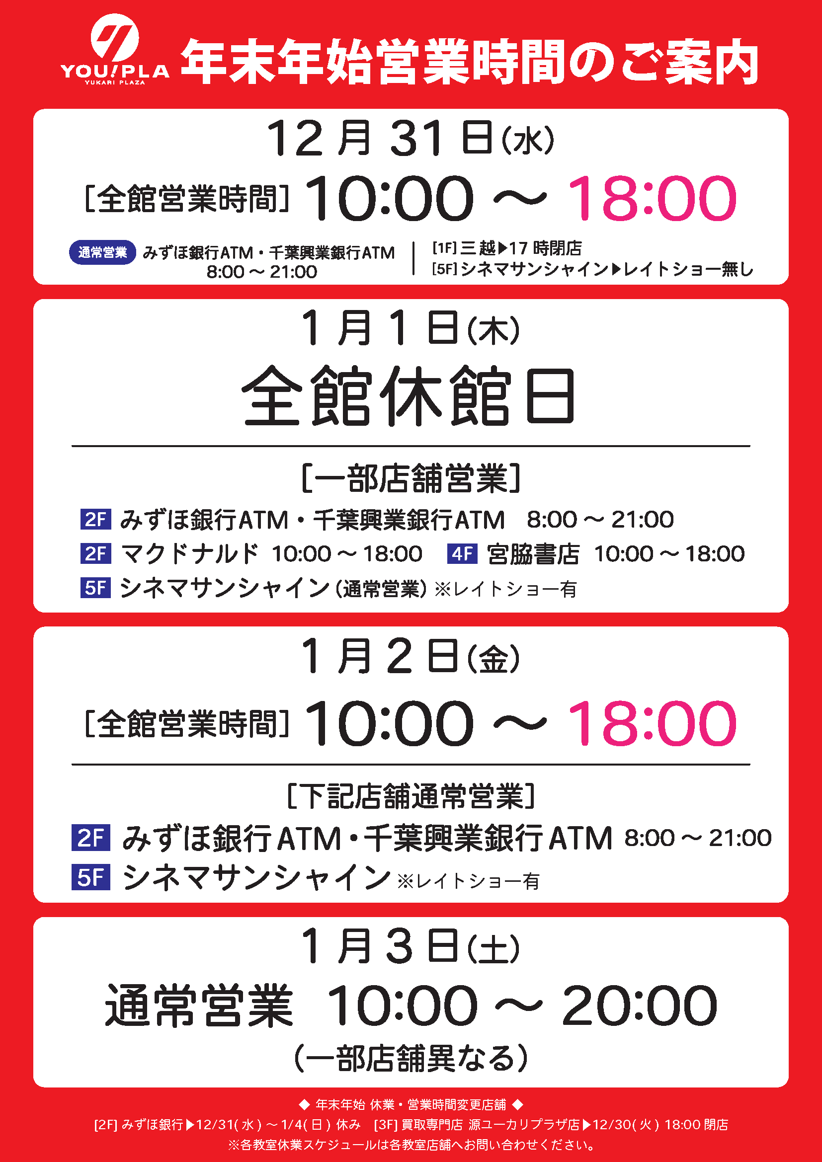 年末年始営業時間のお知らせ いつもユーカリプラザをご愛顧いただき誠にありがとうございます。2025年から2026年の年末年始の営業時間は下記の通りとなっております。※各教室の休業スケジュールは各教室店舗へお問い合わせください。 HOME | イベント個別ページ | 年末年始営業時間のご案内[2025-2026] ページトップへ