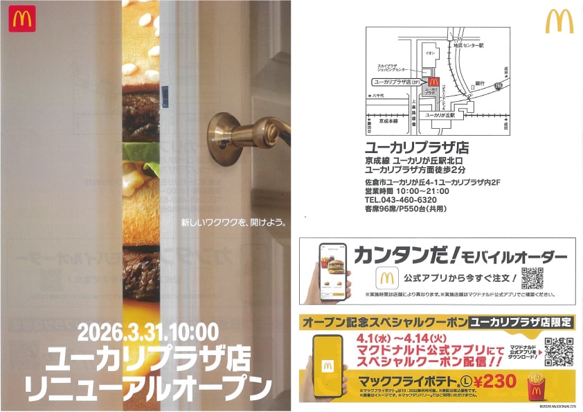 マクドナルド ユーカリプラザ店 フロア 2F 営業時間 10:00~21:00 TEL 043-460-6320 公式サイト https://map.mcdonalds.co.jp/map/12645 ショップより HOME | 各店ページ | マクドナルド ページトップへ フロアガイド アクセス・駐車場